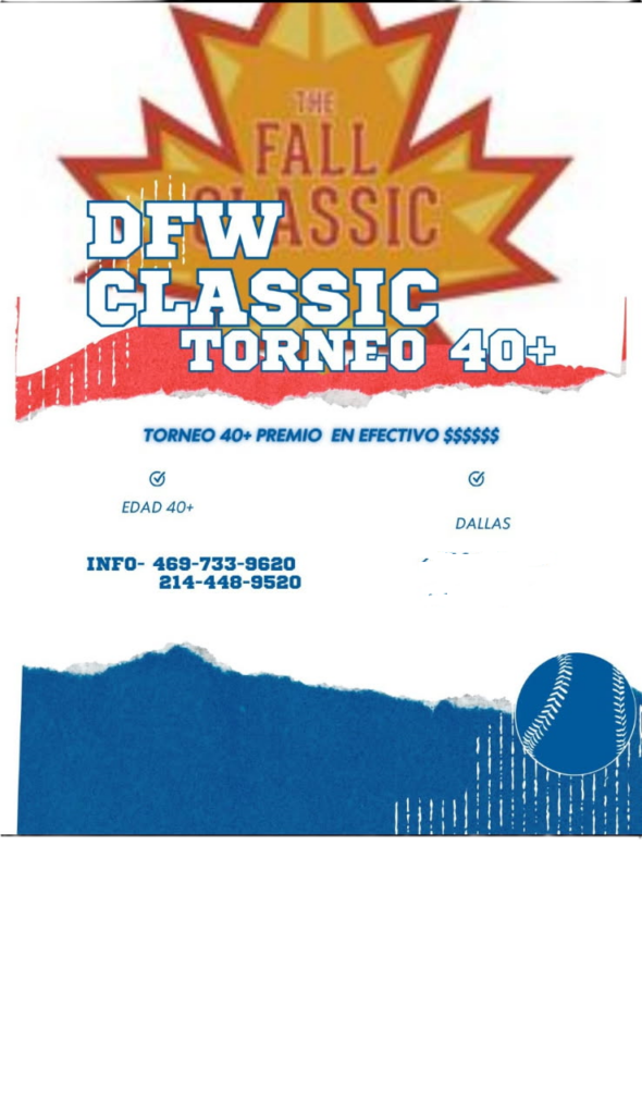 Los días 25 y 26 de Octubre se Celebra El Torneo de Béisbol DFW Classic Torneo 40+ Para mas información comunicarse a los teléfonos 465-733-9672 y 214-448-9520 con un premio de 10 mil dólares costo de inscripción 2 mil dolares minimo 8 equipos , actualmente hay 6 ya registrados Piratas y Baravos de Dallas,Laguneros , Cachorros y Cerveceros de Ft Worth