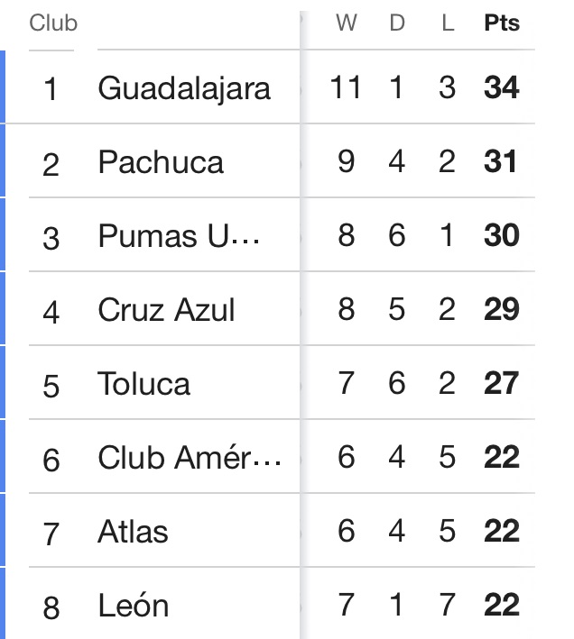 Y en el acecho Tigres 21 -Tijuana 19 – Necaxa 17 (muy pocas esperanzas , pero podría entrar .) de milagro recuerden que hay 6 puntos en juego todavía