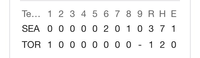En la novena llega a cerrar por Marineros el mexicano Andrés Muñoz Apodaca  de Los Mochis Sinaloa en el 2019 inició su carrera con Los Padres de San Diego y en 2020 llega a Seattle  Tres hombres 3 outs dominio al también mexicano Alejandro Kirk Seattle gana el primero 3 carreras a una y deja a Toronto con sólo dos hits